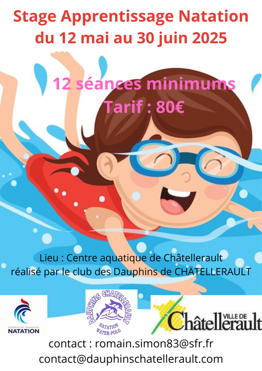 Le club des Dauphins de Châtellerault organise un stage d’apprentissage de la natation au Centre aquatique de Châtellerault, du 12 mai au 30 juin 2025.